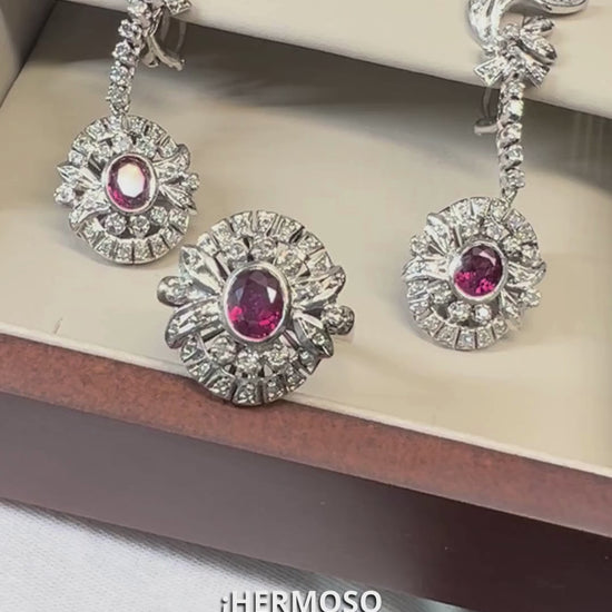 Juego de Anillo y Aretes de Plata Paladio con Rubies y Diamantes Naturales 1.68ct